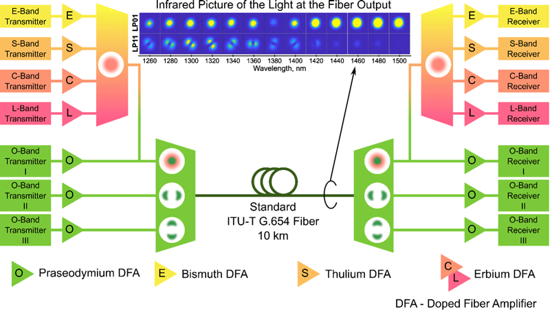 The technology introduces a novel method that multiplies the usable capacity of certain spectral regions by up to three times. This approach exploits the properties of standard-compliant cutoff-shifted optical fibers based on the ITU-T G.654 recommendation, which have been originally designed to operate with light at relatively long wavelengths, in the C and L bands of transmission bands. By using light with shorter wavelengths, in the O-band region, researchers were able to realize three-mode transmission instead of the traditional single-mode transmission. This effectively extended the optical fiber capacity well beyond the intended design by combining single-mode transmission in the E/S/C/L bands with three-mode transmission in the O band. The team achieved a new optical transmission record of 430 Tb/s in international-standard-compliant optical fibers, surpassing the previous our record of 402 Tb/s, which was also set in 2024. Remarkably, the new result was obtained using nearly 20% less overall bandwidth, resulting in a simpler system that demonstrates how existing infrastructure can be pushed even further without costly upgrades.