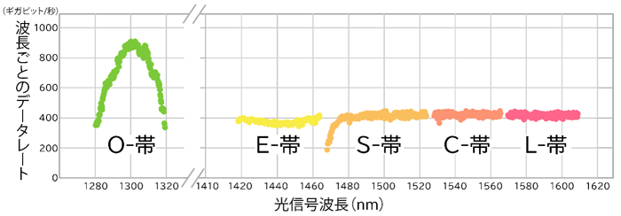 光通信用途で利用可能な波長帯は、C帯(Conventional band、波長1,530〜1,565 nm)とL帯(Long wavelength band、波長1,565〜1,625 nm)、そのほかにT帯(Thousand band、波長1,000〜1,260 nm)、O帯(Original band、波長1,260〜1,360 nm)、E帯(Extended band、波長1,360〜1,460 nm)、S帯(Short wavelength band、波長1,460〜1,530 nm)、U帯(Ultralong wavelength band、波長1,625〜1,675 nm)がある。