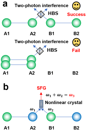 b When the SFG photon is detected, it indicates that there is one photon in each of modes A2 and B1, allowing the successful