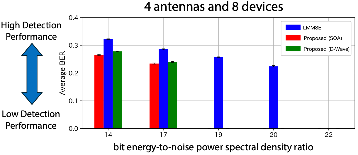 We evaluated block-error-rate performance of the proposed method through numerical simulations under the following conditions: four receive antennas at the base station, QPSK modulation (𝑀=4), and eight connected devices (𝐾=8). This setting corresponds to a combinatorial optimization problem involving approximately 48≈60,000 possible signal combinations. In these simulations, simulated quantum annealing (SQA) was used as the annealing method. The results confirmed that the proposed method achieves higher detection performance than the widely used linear minimum mean square error (LMMSE) approach (see Figure 2).