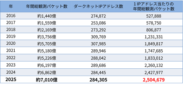 注: ダークネットIPアドレス数(アクティブなセンサの数)は、年間を通じて一定ではなく変化することがあり、2025年は12月26日のアドレス数です。