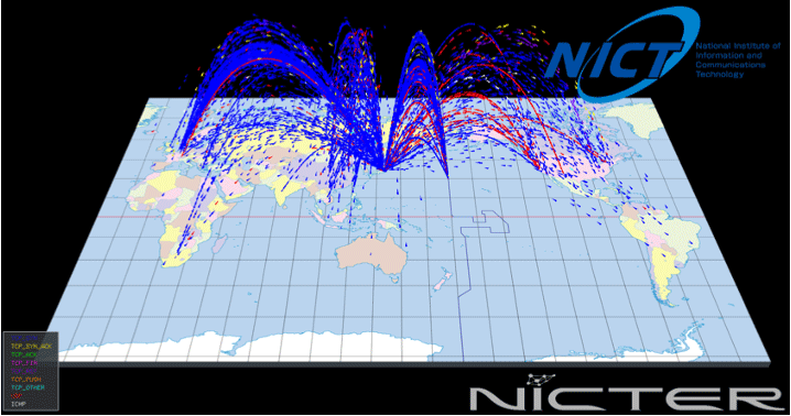図3 NICTER Atlasによるダークネットで観測された通信の可視化