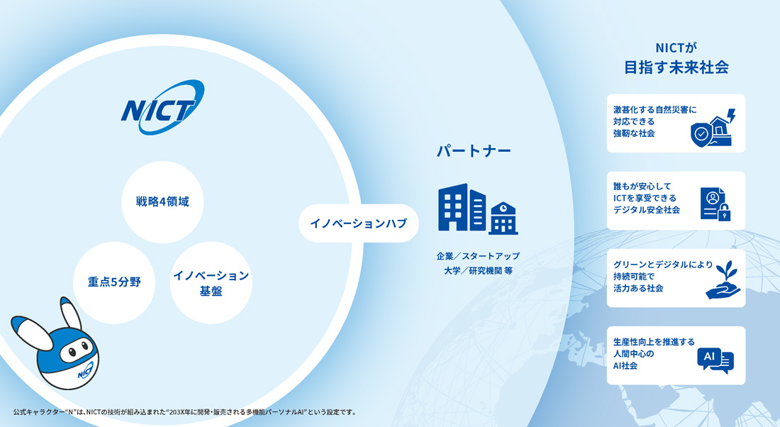 NICTは、「重点5分野」「戦略4領域」「イノベーションの基盤となる研究課題」の研究と、外部機関を繋ぐ「イノベーションハブ」の機能を通して、研究成果の社会実装を促進し、未来社会の実現を目指します。